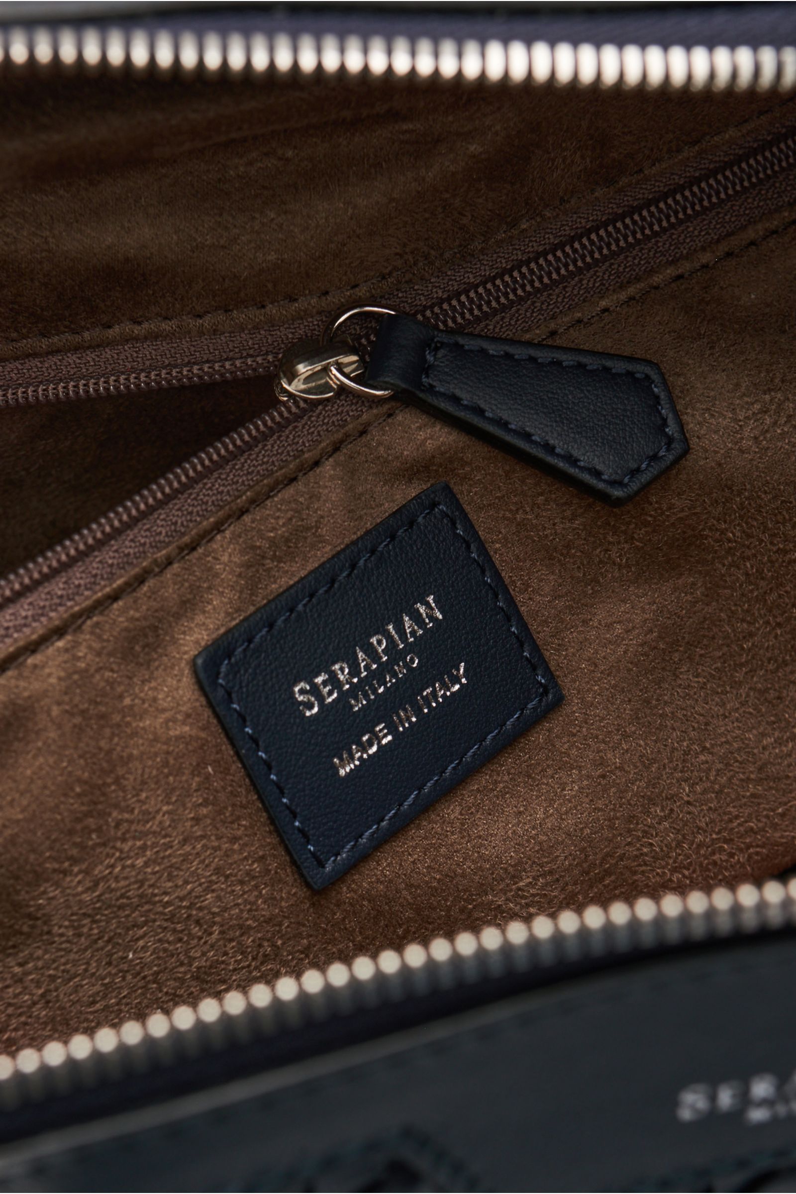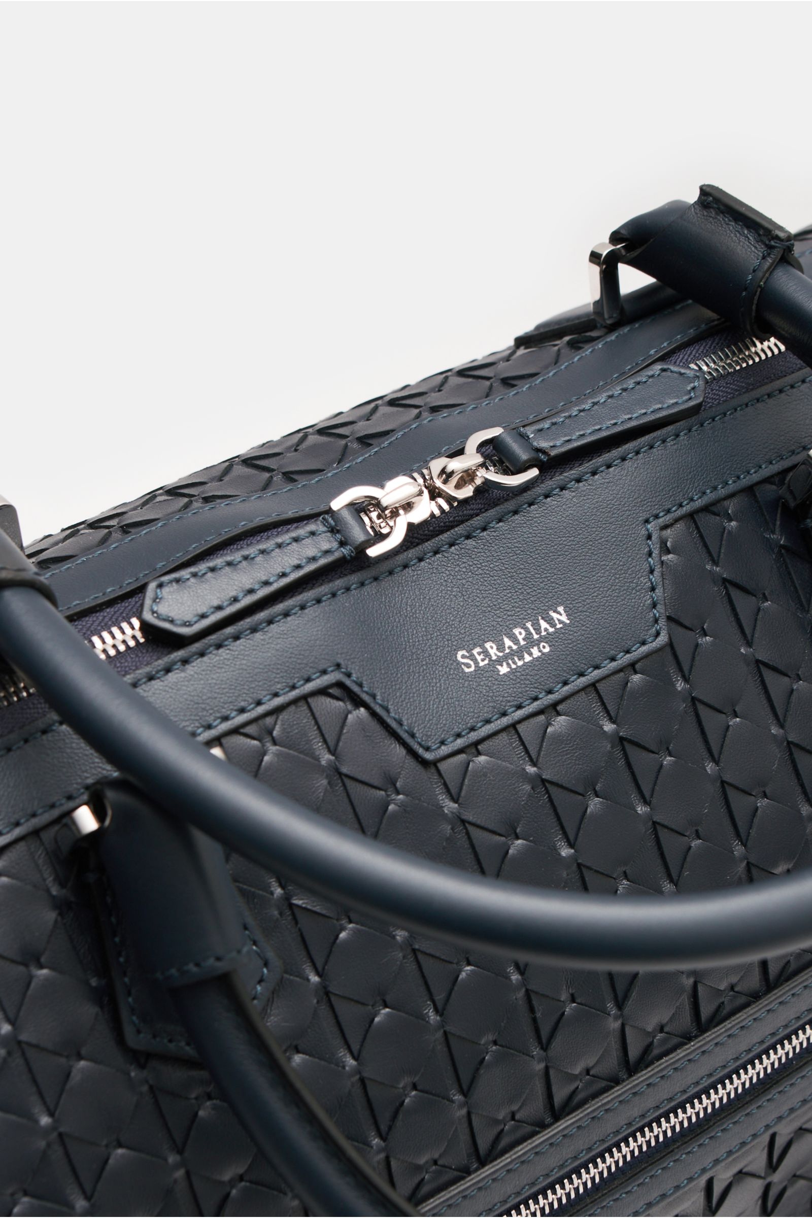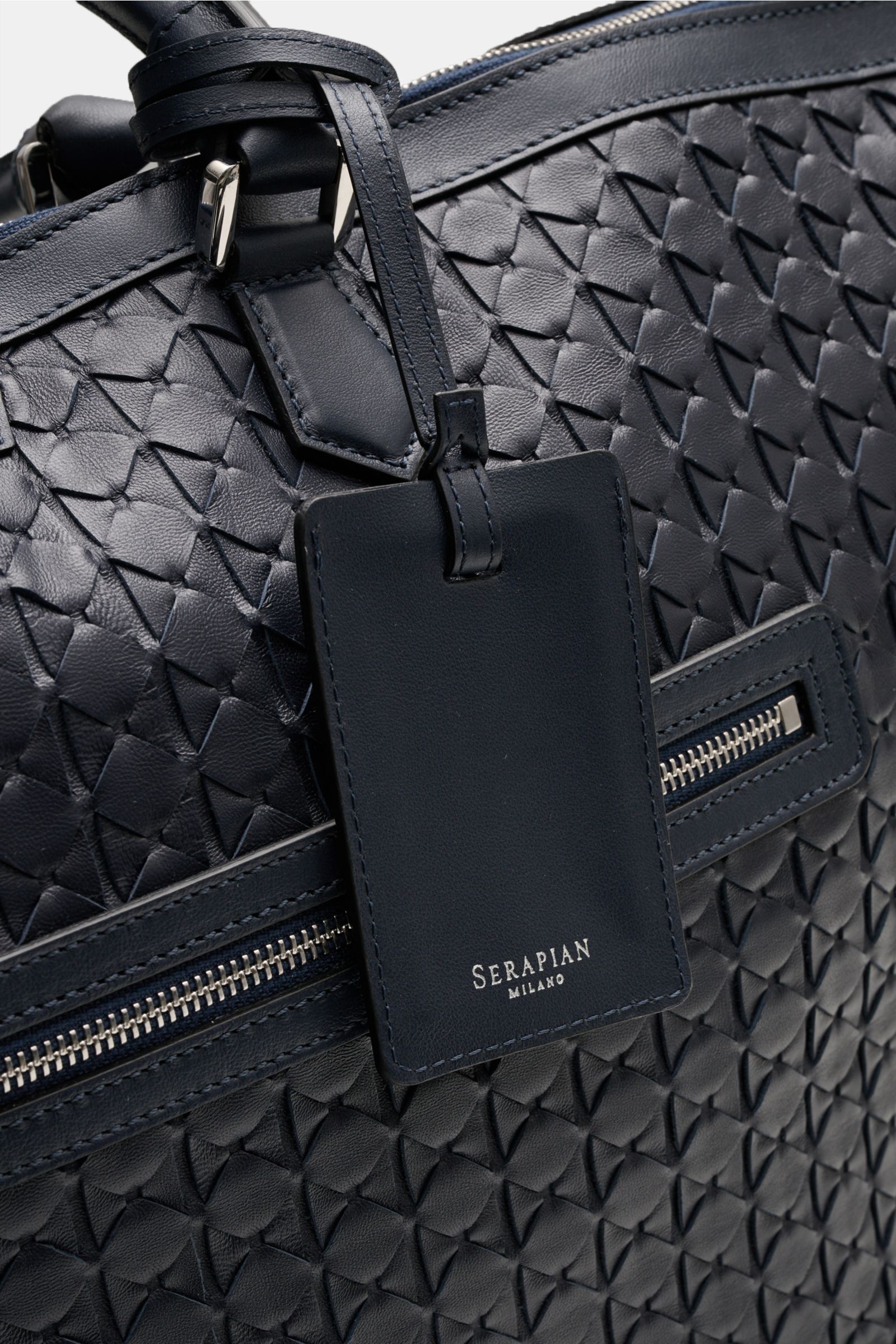 Luxuriös ausgestattet für Business- und Freizeitreisen: Gewebt in der aufwendigen 'Mosaico'-Technik, die in Handarbeit seit 1947 exklusiv bei SERAPIAN Anwendung findet, erhält das butterweiche Nappaleder dieser edlen Reisetasche seine einzigartige Wirkung.