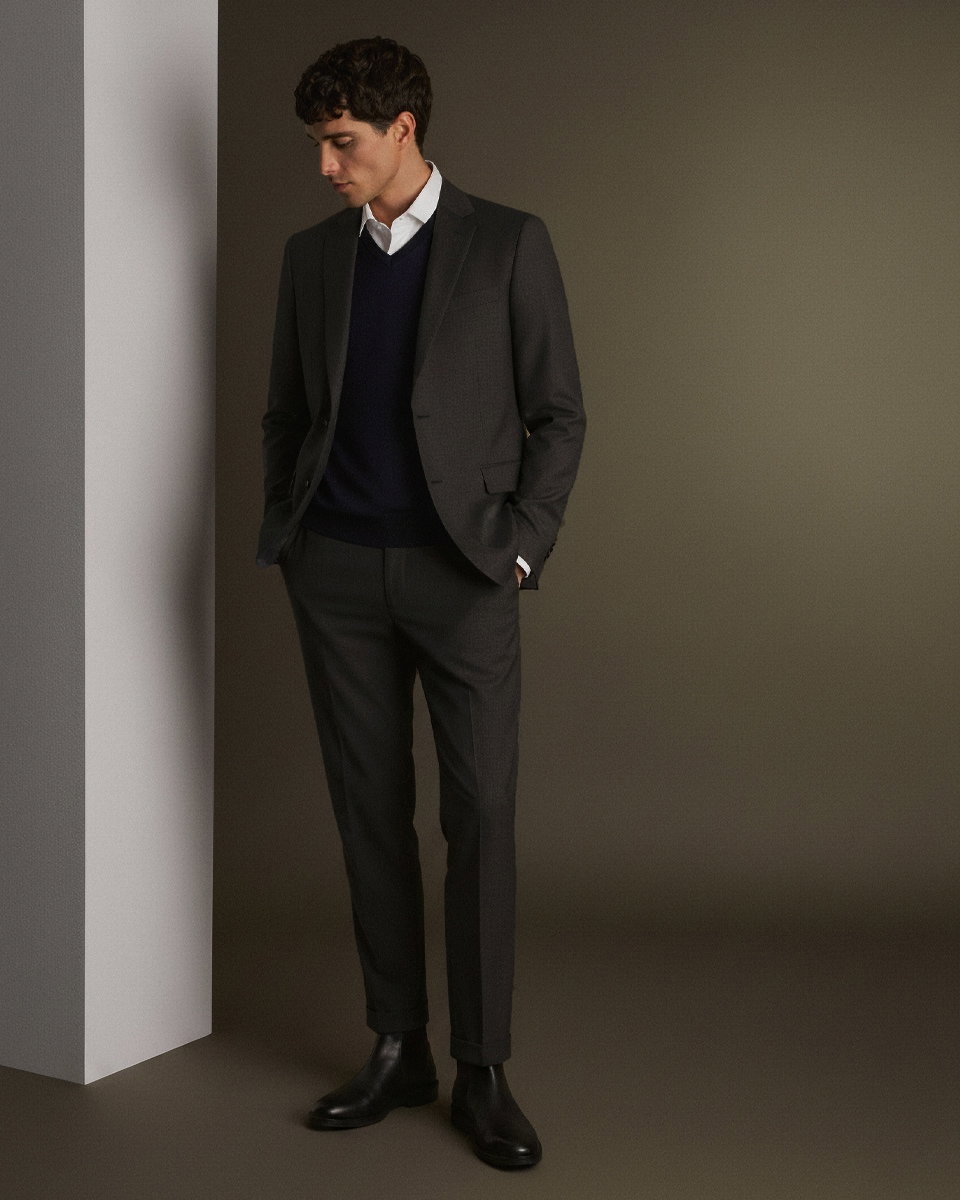 - Smart Casual: Hemd unter dem Strickpullover und Designer-Sakko für Herren, dazu eine Chino und Chelsea Boots.