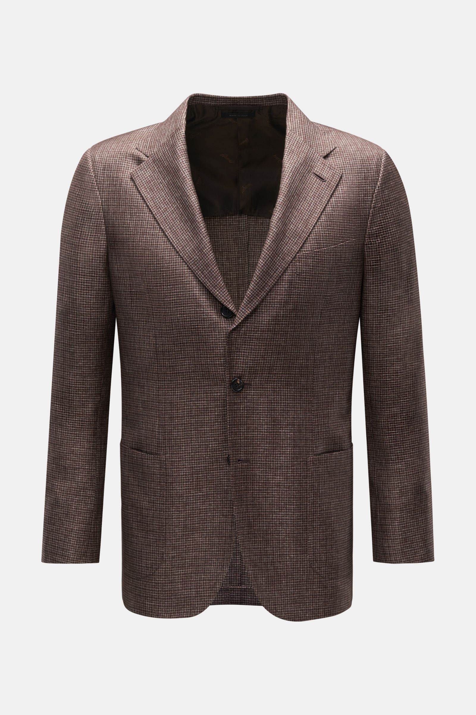 Lightweight classic from BRIONI: The single-breasted 'Amalfi' smart-casual jacket embodies timeless elegance with its fine checked pattern and masterful fabrication in virgin wool and silk.
