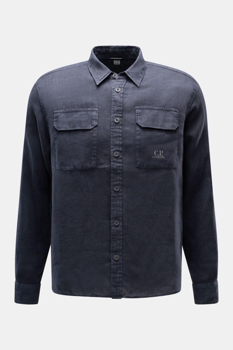 10. Front view of a C.P. Company Overshirt navy layered over a white shirt, made of pure cotton, slim fit with six-button placket, turn-down collar, three front pockets including sleeve logo detail, and cuffed sleeves, perfect for casual urban spring looks.