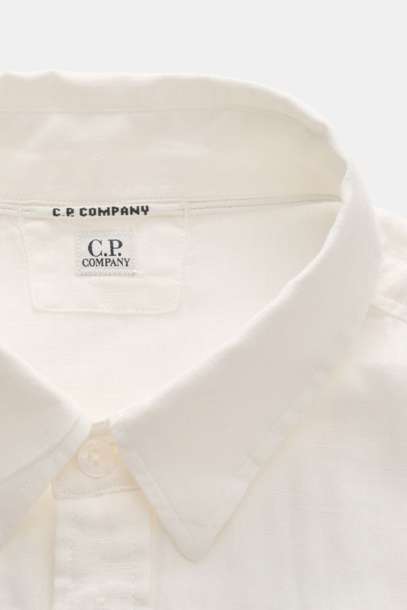 Close-up front top view of C.P. Company Crew neck sweatshirt cream showing ribbed collar and white brand label inside neck, made of garment-dyed pure cotton with lightweight robust fabric, regular fit, snap button pocket on upper sleeve, signature lens de